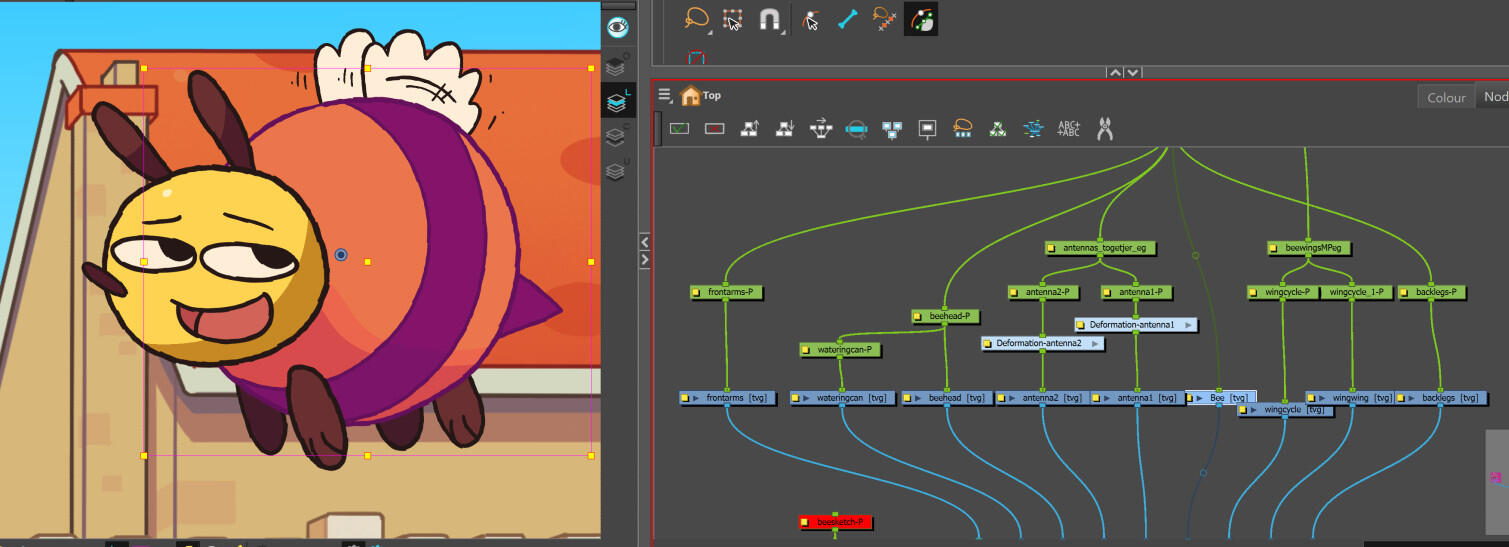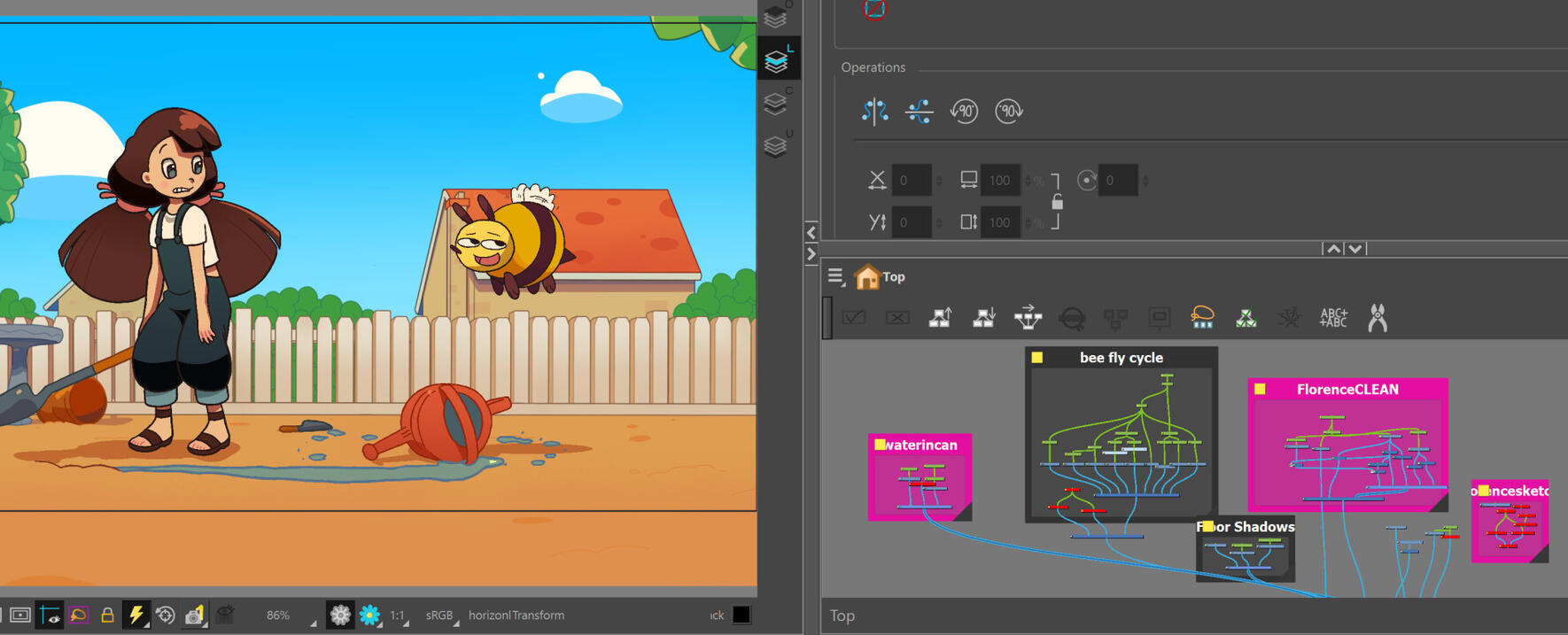 I knew I wanted shadows and extra details, but I wanted to make sure that was doable within the time I had. I learned a lot about the Toon Boom Harmony node system. Use of deformers and cutters allowed me to finish the whole film according to my original vision. (For example, I had a system that automatically colored my shadows using the correct palette.)